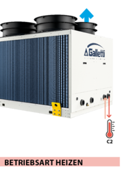 Hier wird der Kühlkreislauf umgekehrt, wodurch das Gerät zu einer Wärmepumpe wird: Sie entzieht der Außenluft Wärme und überträgt diese auf das Wasser der Anlage (C2), das dann zum Heizen der Räume verwendet wird. Die Belüftung ist aktiv, der Kühlkreislauf der Maschine (C1) bleibt inaktiv.