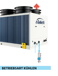 In dieser Betriebsart funktioniert das Gerät wie eine herkömmliche Kältemaschine: Es entzieht dem Wasser der Anlage (C1) Wärme, um die Räume zu kühlen (z. B. im Sommer), und leitet diese über das Luftregister nach außen ab. Die Belüftung ist daher aktiv, um den Kondensationswärmeaustausch zwischen Luft und Kältemittel zu ermöglichen. Der Heizkreislauf des Geräts (C2) – der normalerweise eine Heizungsanlage versorgen würde – bleibt inaktiv.