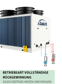 Das Gerät arbeitet gleichzeitig für zwei Verbraucher: einen, der gekühlt werden muss (C1), und einen, der beheizt werden muss (C2). Anstatt die Wärme wie in Betriebsart „Nur Kühlen” nach außen abzuleiten, gewinnt das Gerät die durch die Kühlung erzeugte Wärmeenergie vollständig zurück und nutzt sie zum Erhitzen des Wassers. Die Belüftung ist inaktiv, wodurch die Effizienz der gesamten Einheit maximiert wird. Diese Ausführung ist ideal für Gebäude mit entgegengesetzten und gleichzeitigen thermischen Lasten (Hotels, Krankenhäuser, Wellnesszentren usw.).